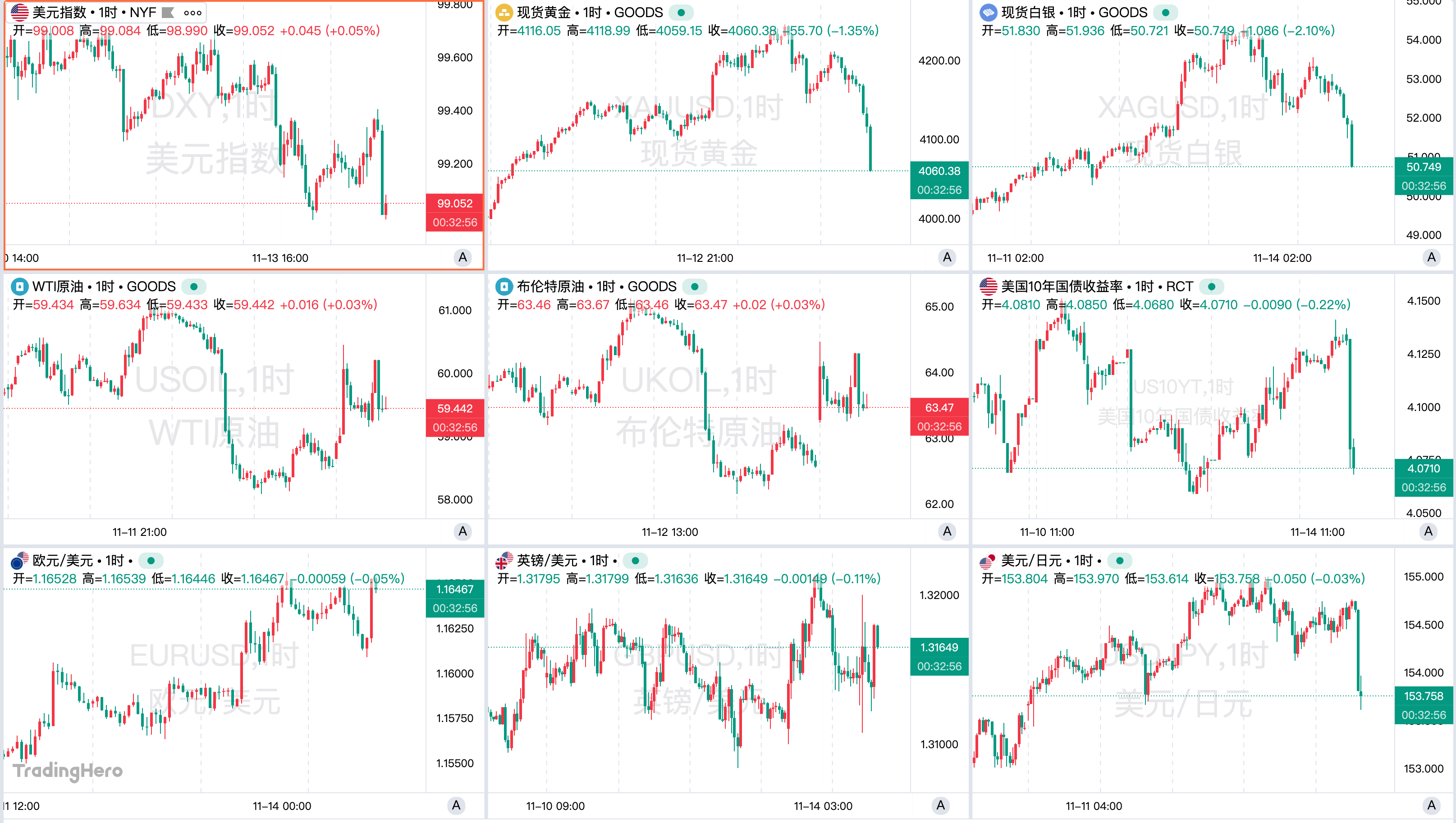 美元指数本周整体略微承压,一度跌破99关口,料将连续第二周收跌。美国政府最长停摆结束,关键经济数据仍需时间才能陆续公布。美联储官员陆续释放鹰派信号,12月降息概率下降。