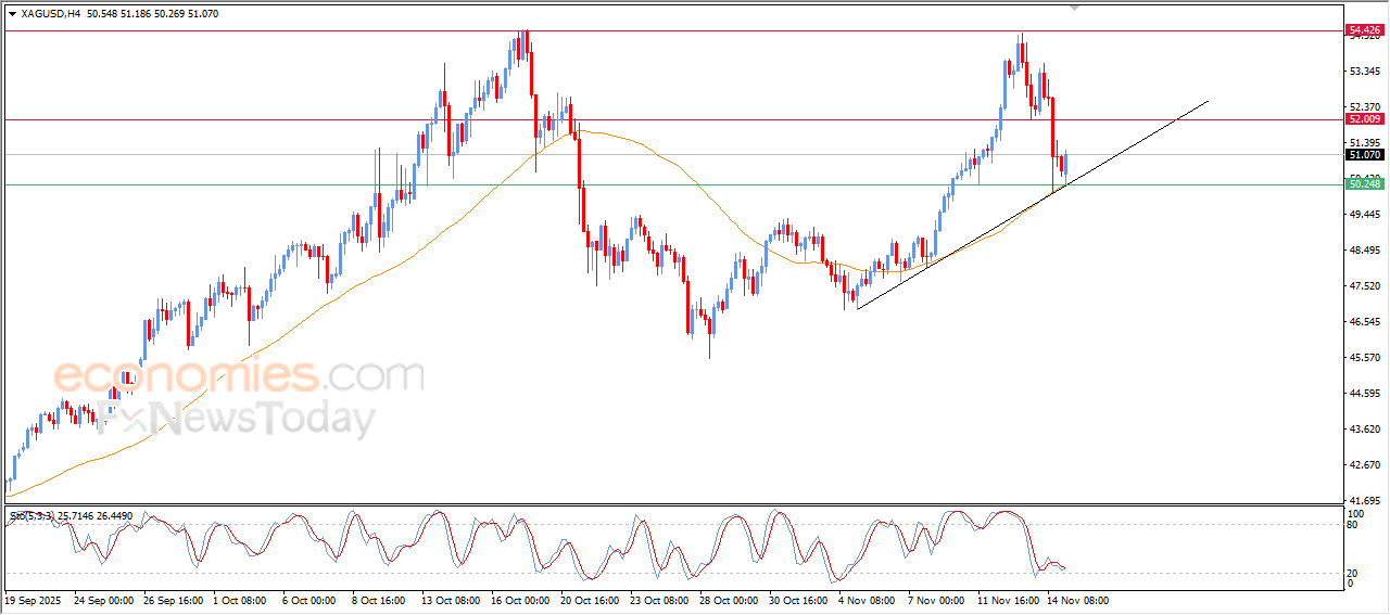 Economies.com的分析师今日最新观点: 现货白银价格在上一交易日盘中上涨,主要受益于其依托EMA50均线的支撑,获得了一定的上行动能,助力其实现了本轮涨幅。同时,现货白银在短期内测试了次级上升趋势线,进一步强化了这一上行动能。另一方面,我们注意到,尽管相对强弱指标(RSI)依然处于超卖区间并保持稳定,但已出现部分负面信号,这可能会限制现货白银后续涨幅的空间。