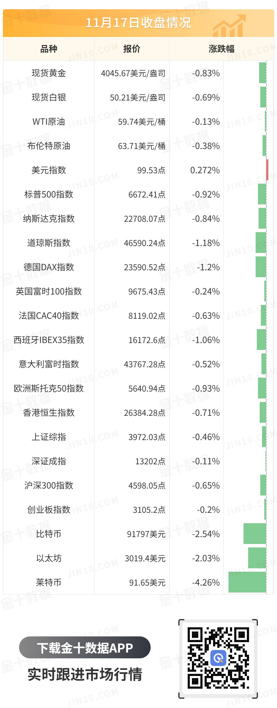 周一,得益于美联储12月降息预期降温,美元指数延续反弹,最终收涨0.272%,报99.53;美债收益率持稳,基准的10年期美债收益最终收报4.143%,对美联储政策利率敏感的2年期美债收益率收报3.619%。