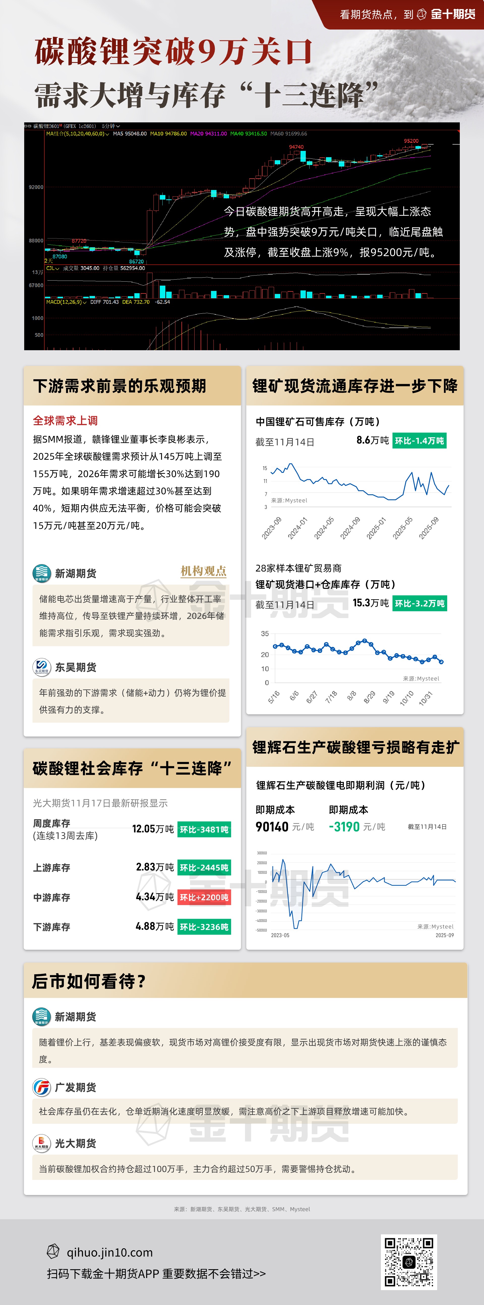 3小时前 碳酸锂触及涨停,需求提振以及库存持续去化 | 金十期货热图