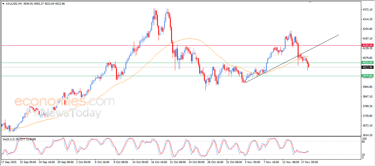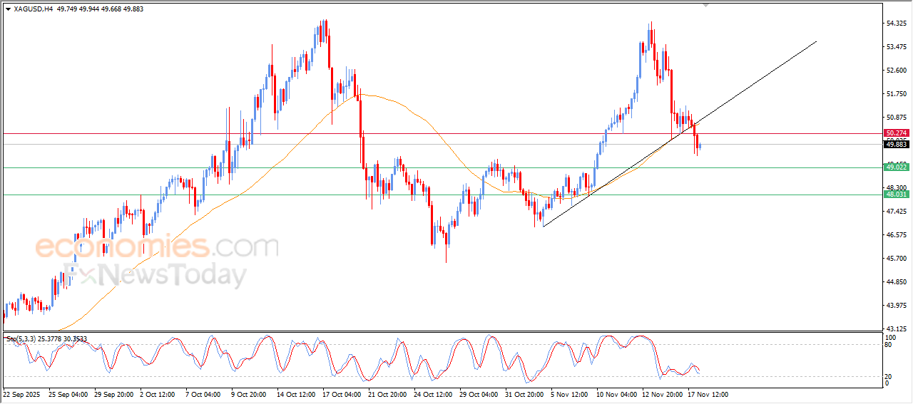 Economies.com的分析师今日最新观点: 现货白银价格盘中收低,主要受短期内跌破上行趋势线的影响,同时期价跌破了其EMA50均线的支撑位,加剧了价格的下行压力。这一走势强化了未来一段时间内现货白银价格进一步下跌的可能性。与此同时,相对强弱指标(RSI)在超卖状态释放后也出现了负面信号,进一步支持了价格延续跌势的预期。