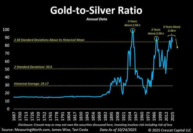 尽管经历了历史性上涨,白银仍显相对便宜:金银比现在超过80点,接近自1980年代以来的最高水平。根据Crescat Capital的数据,这比其长期历史平均水平高出约2.58个标准差。
