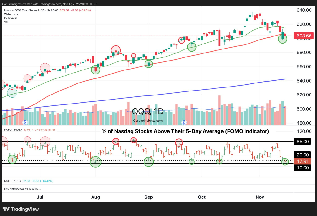 美股市场的FOMO指标目前处于"恐惧"区间,这一水平在今年曾多次成功阻止行情进一步回调。市场接下来的反应将非常关键,它将决定此轮调整是会进一步深化,还是仅仅是又一次洗盘行情。