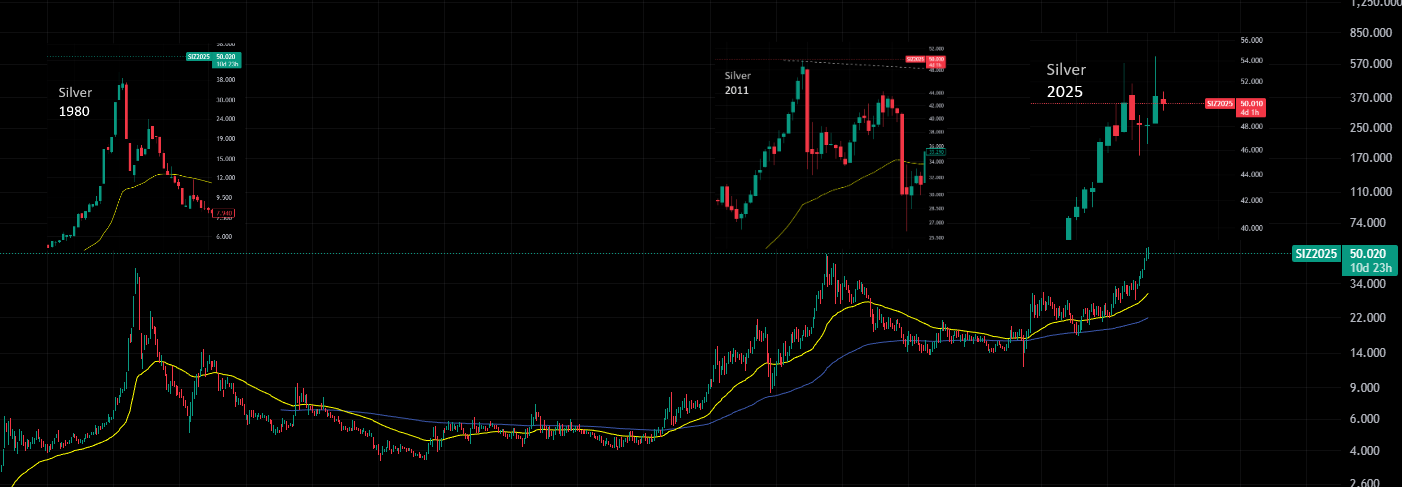 白银在此价格区间的表现堪称历史最佳。1980年与2011年的抛售轨迹在六周时间维度上呈现诡异的相似性,而2025年的走势则截然不同——事实上,当前价格在保持低级别周期全部动能的同时,正在构筑看涨技术形态。