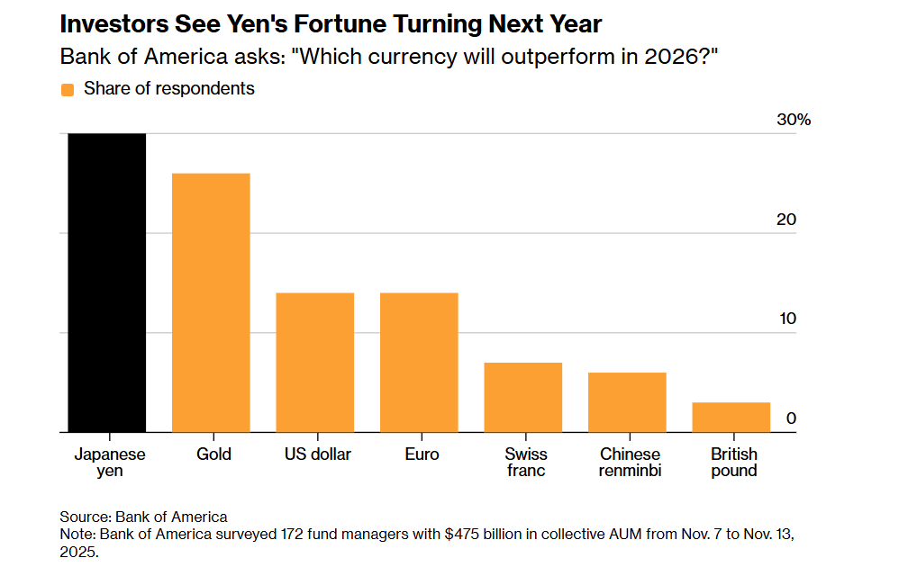 该行调查的约170位基金经理中,约三分之一表示日元明年将实现最佳回报,紧随其后的是黄金和美元。仅3%的受访者将英镑列为首选货币。