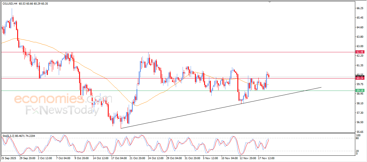 Economies.com的分析师今日最新观点:WTI原油期货价格小幅回落,这似乎是此前价格上涨后的获利回吐行为。在触及60.25美元这一关键阻力位后,价格出现回调,该阻力位也是短期内横盘整理区间的上沿。