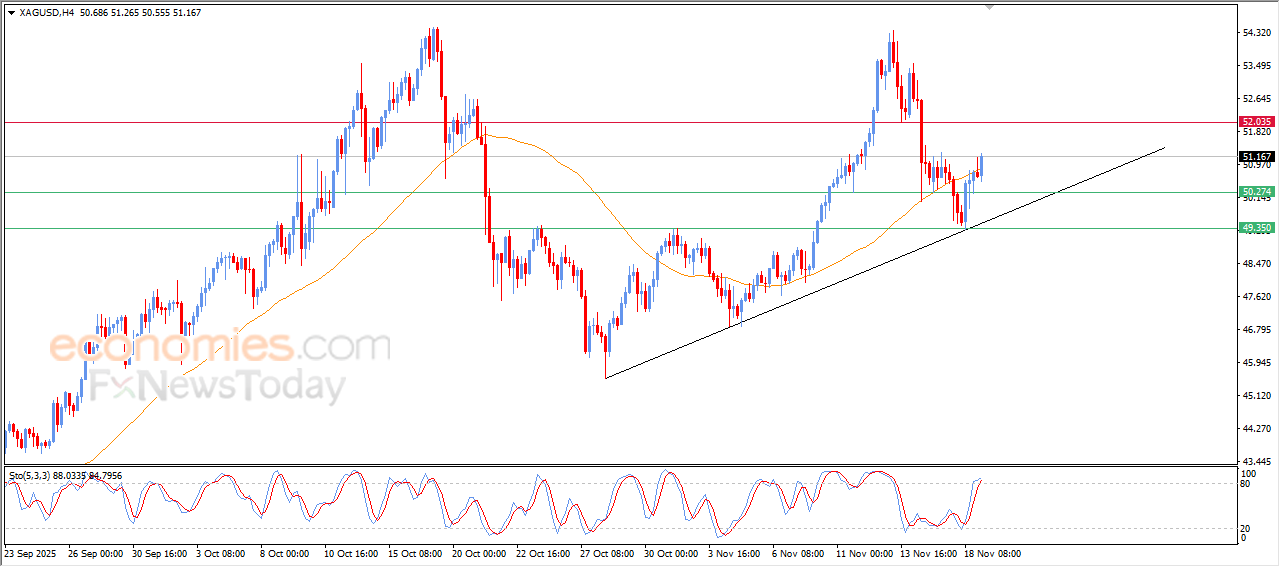 Economies.com的分析师今日最新观点:现货白银价格持续上涨,突破了其EMA50均线的阻力,摆脱了此前的负面压力,上涨趋势占据主导,且短线走势沿着次级趋势线运行。另一方面,我们注意到在相对强弱指标上出现了负面重叠信号,表明价格已进入超买区间,这可能会限制后续的上涨空间。