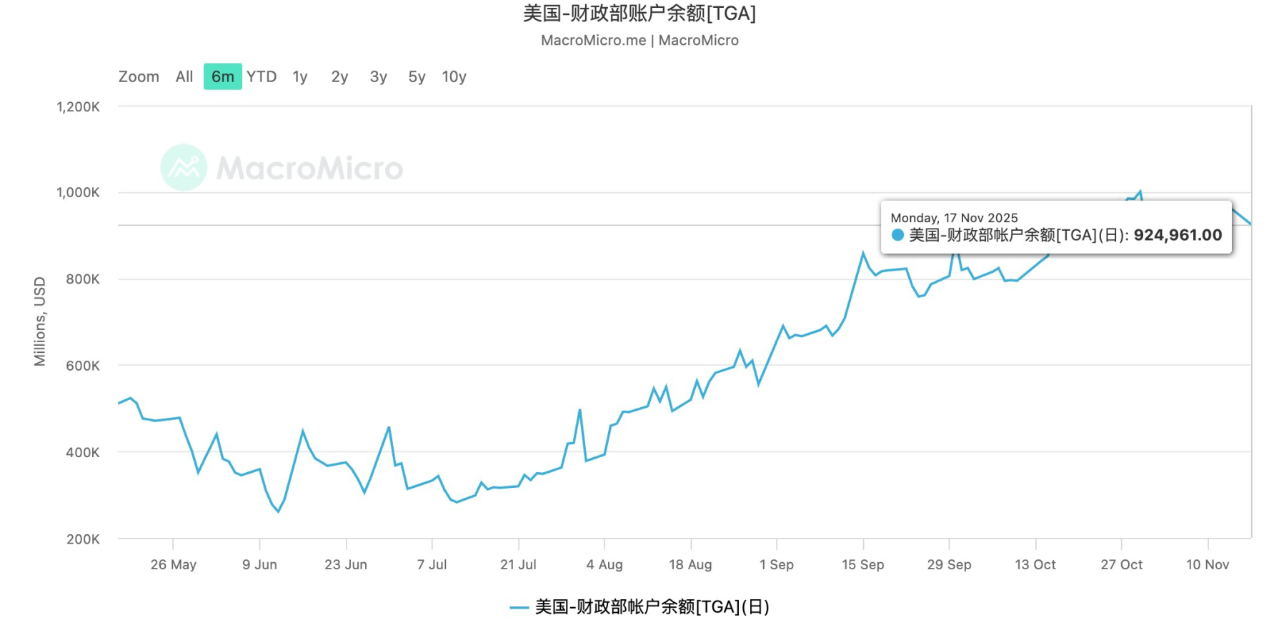根据最新更新的数据,截止11月17日,美国财政部TGA账户余额自重启后第一次下降了300亿美元,也就是说市场期待已久的流动性释放终于开始了。