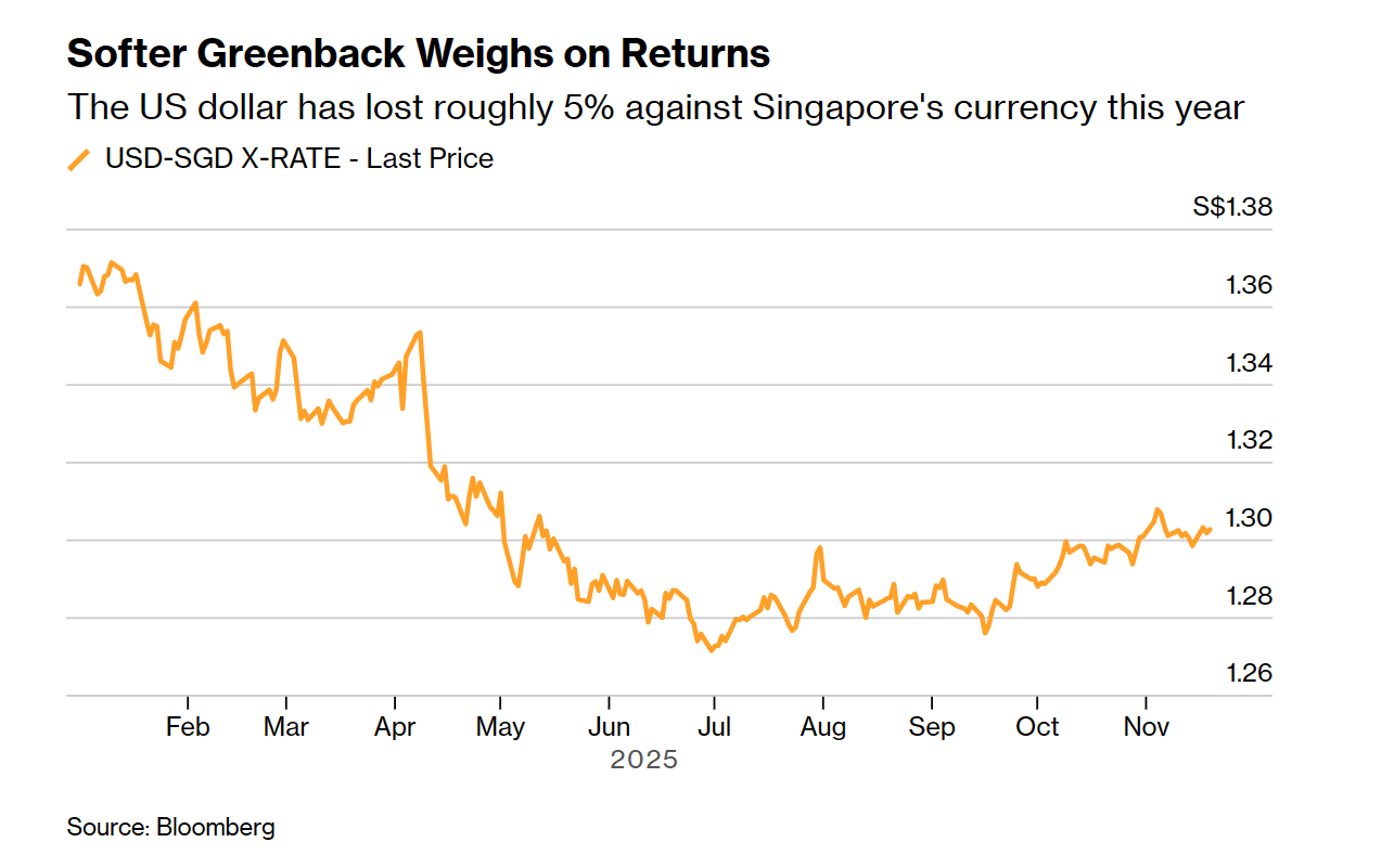 今年以来,彭博美元现货指数已下跌近7%,美元兑新加坡元也贬值了约5%。尽管美国仍然是许多大型机构和资产管理公司的首要投资目的地,但美元的下跌已经侵蚀了非美元基准投资者的回报。