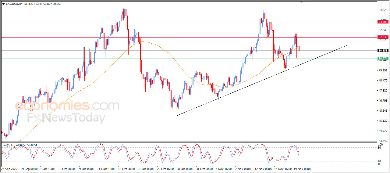 Economies.com的分析师今日最新观点: 现货白银价格出现回落,主要由于52.00美元的阻力位保持稳定。该阻力位正是我们此前分析中预期的目标位。现货白银试图积聚更多的上涨动能,以助其突破该阻力位,同时也在相对强弱指标上尝试消化部分超买状态,尤其是在出现负面信号的情况下,导致价格跌破其EMA50均线支撑。这一走势可能会降低未来一段时间内价格反弹的概率,但目前主导趋势依然为多头,并且短期内价格仍沿着次级趋势线运行。