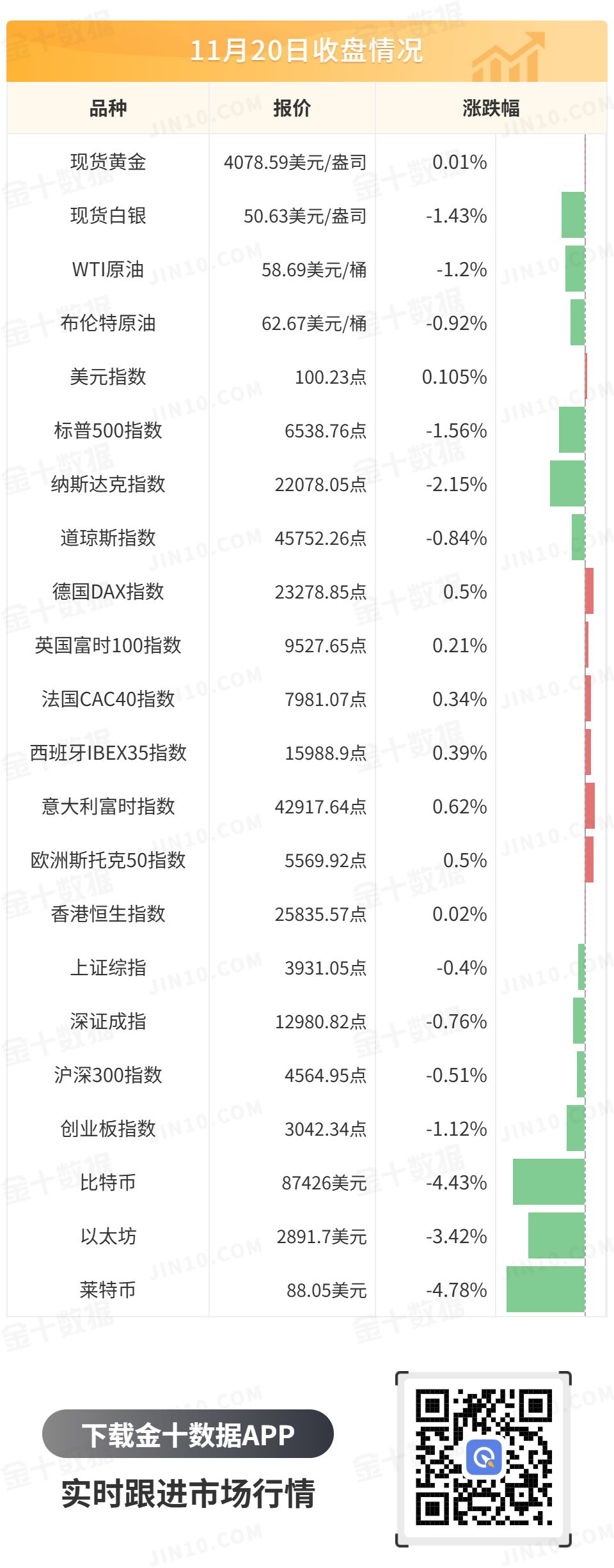 现货黄金区间震荡,美盘再度触及4100美元/盎司,但随后回落,最终微涨0.01%,报4078.59美元/盎司;现货白银最终收跌1.43%,报50.63美元/盎司。