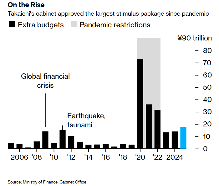 日本首相高市早苗内阁批准了自疫情以来最大规模的追加支出计划,通过一揽子方案拨付资金以缓解选民不满,但此举可能引发密切关注日本财政状况的投资者的不安,已导致日元汇率跌至10个月低点,超长期政府债券收益率则飙升至历史最高水平。