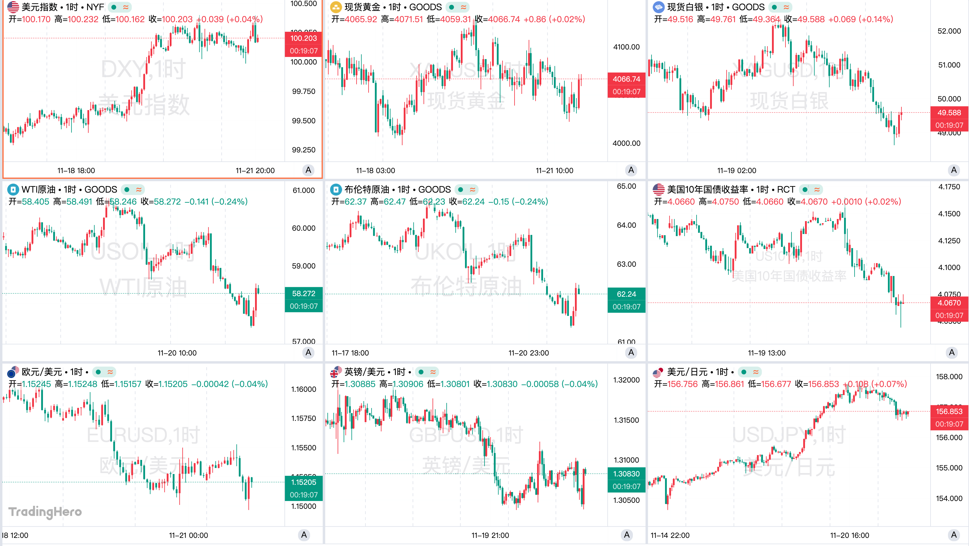 美元指数本周整体走强,四天连涨、一度上破100关口并创近两周新高。驱动因素主要是美联储12月降息预期降温、避险情绪升温以及就业数据喜忧参半带来的政策不确定性。