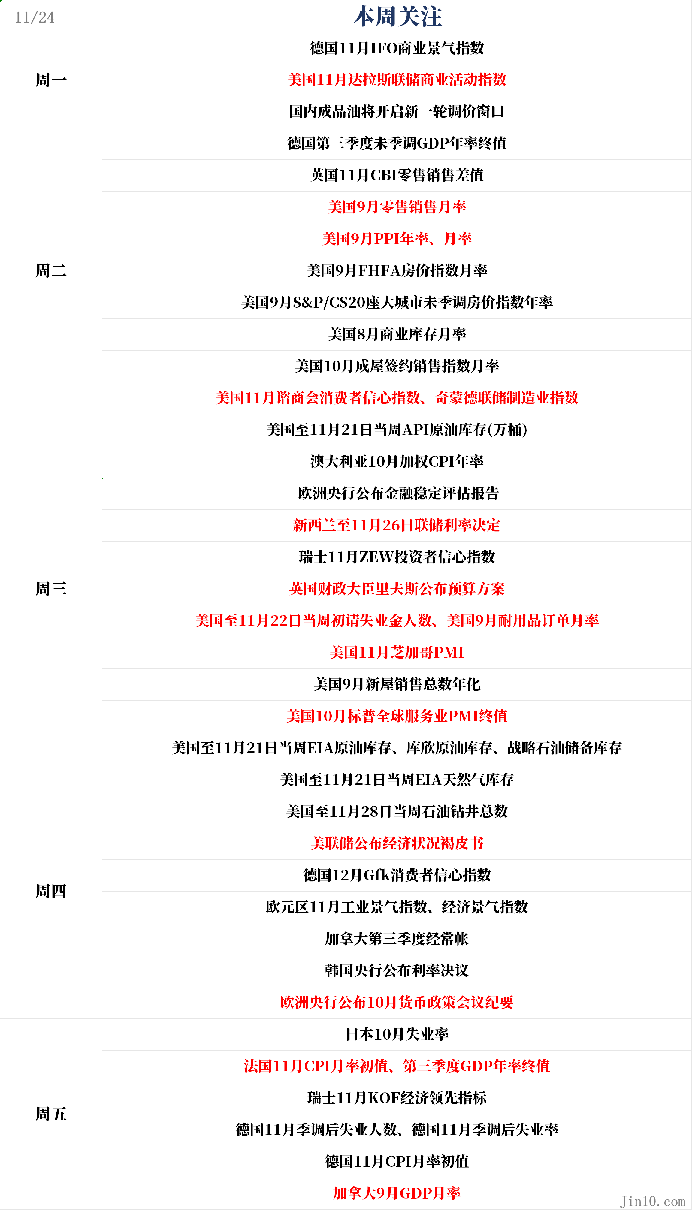 对美国而言,由于迎来感恩节假期,下周不会太繁忙,这意味着数据将集中在本周的前三天公布。