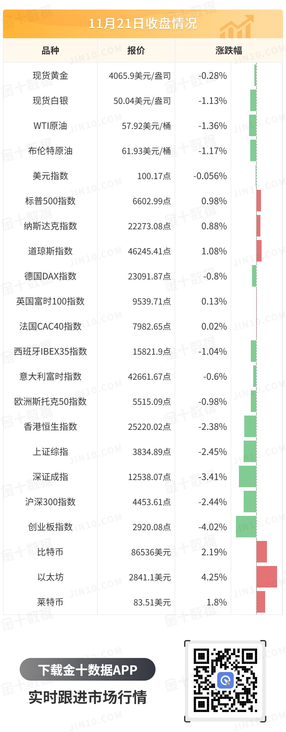 现货黄金盘中跌超1%后一度转涨,但尾盘再度走弱,最终收跌0.28%,报4065.9美元/盎司,且录得本月来首次周度下跌;现货白银最终收跌1.13%,报50.04美元/盎司。