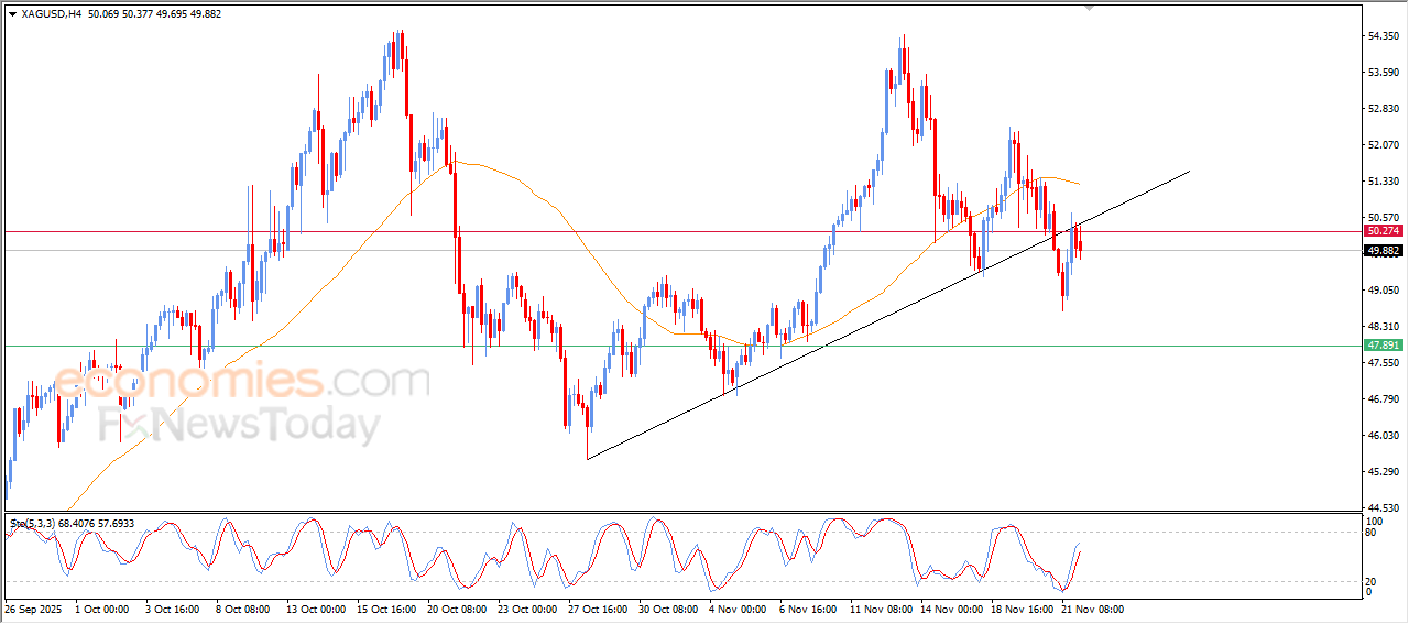 Economies.com的分析师今日最新观点:现货白银价格在最新的日内交易中出现下跌,主要是在相对强弱指标上消化了此前的超卖状态后,测试了短期内此前已被跌破的小型上升趋势线。这一走势使得现货白银承受了更大的负面压力,迫使其价格进一步回落。尤其是在现货白银持续运行于EMA50均线下方,形成了持续的负面和动态压力,这进一步降低了其短期内持续反弹的可能性。