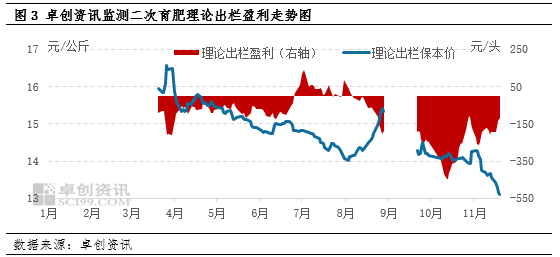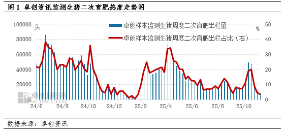 卓创资讯数据显示,2025年样本企业出栏量流入二次育肥渠道占比下滑。截至11月20日,2025年样本企业生猪出栏量流入二次育肥渠道占比为12.95%,较2024年6月至年底下滑6.36个百分点;其中流入二次育肥渠道占比大于10%的时间段占总时段的54%左右,较2024年6月至年底降低16个百分点左右。2025年猪价震荡下滑,二次育肥养殖户对后市看涨预期不高,同时较低的猪价导致二次育肥养殖户长时段亏损,叠加政策方面禁止二次育肥,使得2025年二次育肥热度明显降低,对猪价的托底作用减弱。