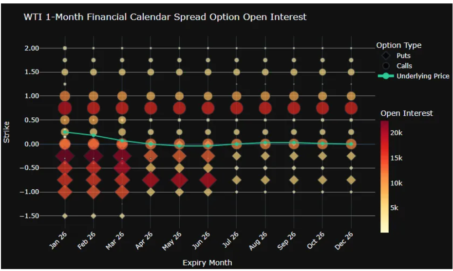 在原油的一个月期日历价差期权(该期权合约用于表达对供应过剩或不足的看法)中,一些最大持仓正在押注短期价差走弱。过去几天,买入看跌期权的成本有所上升,这一迹象表明,在乌克兰与俄罗斯持续和谈的背景下,市场对油价下跌的预期正在升温。即便如此,布伦特原油和西德克萨斯中质油(WTI)的看涨与看跌期权未平仓合约仍大致均衡,反映出市场在双向对冲风险。