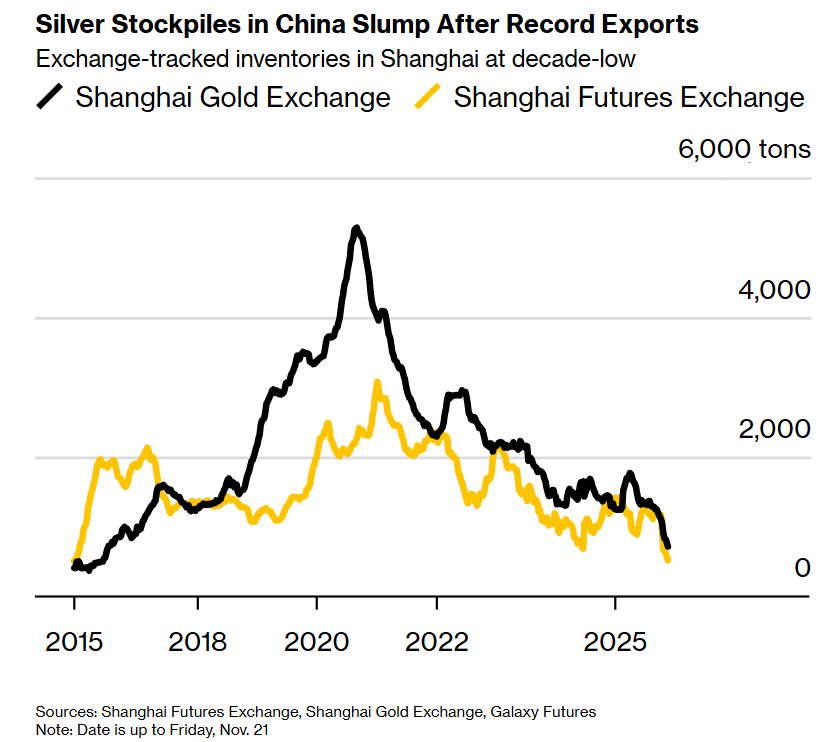 出口创纪录后,中国白银库存大幅下滑。交易所追踪的上海库存降至10年来的最低水平