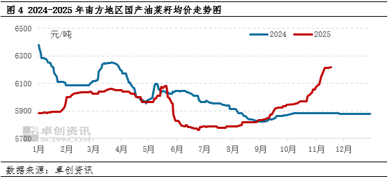 国产油菜籽市场却迎来不同的景象。随着进口油菜籽供应“断档”,国产油菜籽需求量开始明显增加,贸易商走货速度加快,支撑油菜籽价格快速上涨。据卓创资讯统计,11月21日国内南方地区国产油菜籽均价为6219元/吨,较去年同期相比上涨297元/吨,涨幅为5.02%。