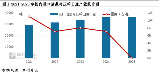 “十四五”期间,面对进口油菜籽行业的不断扩张,国产油菜籽行业发展可谓“举步维艰”。进口油菜籽及其下游产品凭借价格低的优势,长时间占据国内菜系市场的主流地位,进口油菜籽产能同样呈现不断增加趋势,2021-2024年连续四年有新产能投产。据卓创资讯统计,2025年国内进口油菜籽日度压榨产能为36200吨,较2024年相比持平,2021-2025年国内进口油菜籽日度压榨产能平均增幅为6.75%,可见进口油菜籽行业在国内菜系市场中的份额不断扩大。