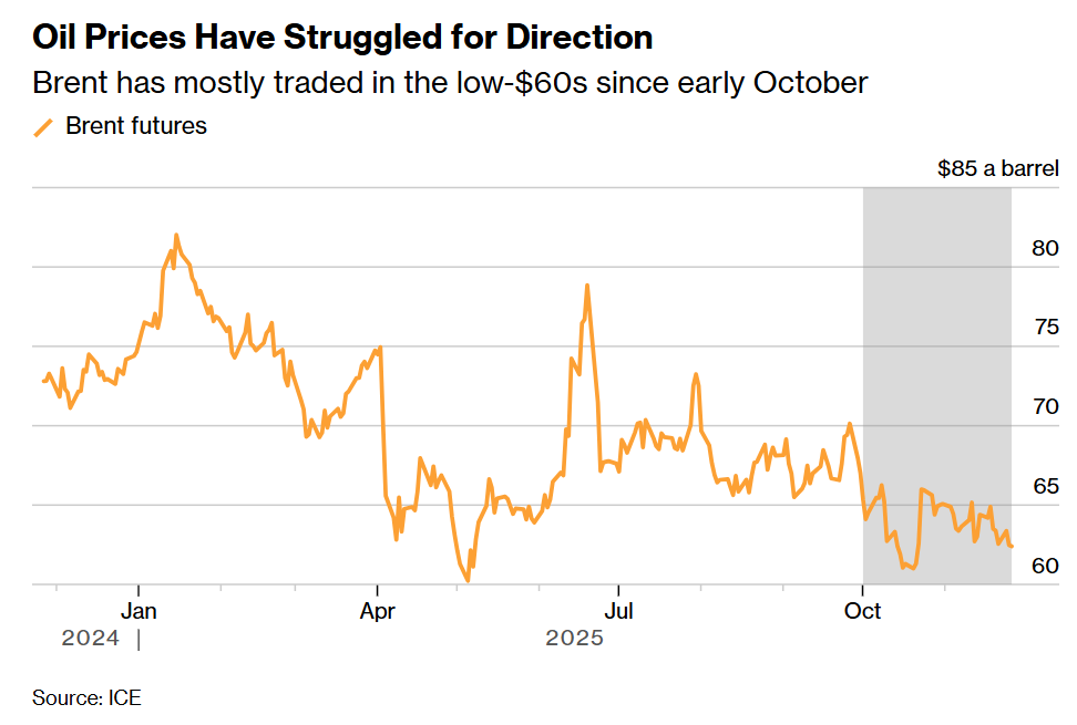 布伦特原油期货目前的交易价格仍高于美国宣布制裁俄罗斯两大石油生产商——俄罗斯石油公司(Rosneft PJSC)和卢克石油公司(Lukoil PJSC)之前的水平,略高于每桶60美元。自10月初以来,油价也一直维持在相对狭窄的区间内波动。