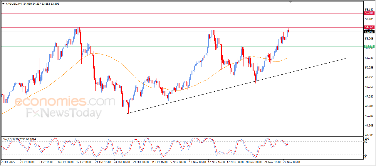Economies.com的分析师今日最新观点:现货白银价格在上一交易日盘中收高,正准备冲击54.35美元的关键阻力位。当前,现货白银受益于其位于EMA50均线之上的动态支撑,同时短期内主升趋势占据主导,且价格沿趋势线运行。值得注意的是,相对强弱指标(RSI)在消化超买状态后,已出现积极信号,这为现货白银在短期内实现更多上涨空间打开了大门。