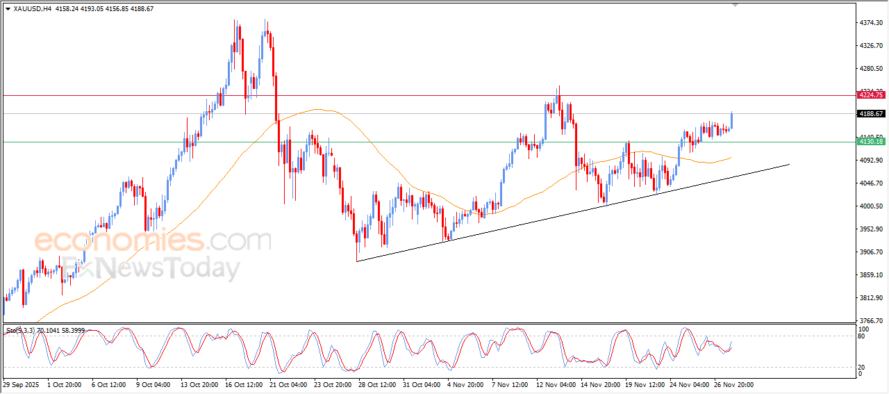 Economies.com的分析师今日最新观点:现货黄金在近期盘中交易中表现强劲,受益于相对强弱指标(RSI)出现积极信号,显示在经历一段相对平静期后,买盘动能有所增强。本次盘中上涨是在获得新的多头动能后出现的,进一步巩固了短期内多头走势的稳定性。