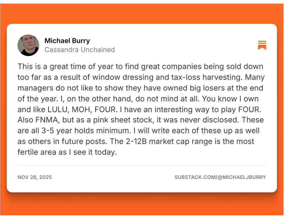 伯里还表示,现在是“一年中寻找被过度抛售的优秀公司的绝佳时机,这些抛售源于基金经理粉饰业绩和投资者的税收损失收割”。他解释说,“许多基金经理不喜欢在年底展示他们持有大幅亏损的股票”,但他并未受此困扰。