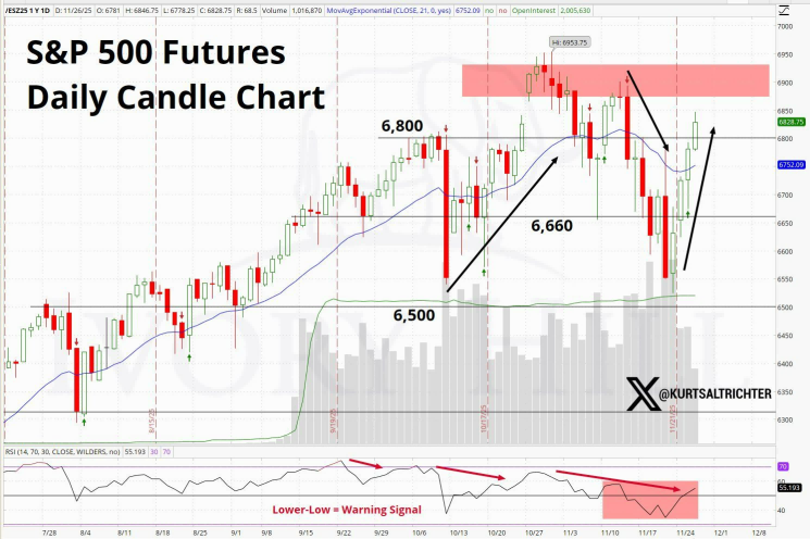 标普500期货始终未能有效突破6900关口。虽然多头在6660一线进场护盘,但动能指标持续呈现低点下移的疲态。如果市场期待圣诞行情降临,恐怕需要更强劲的动能支撑。当前走势不过是伪装成突破形态的区间震荡罢了。