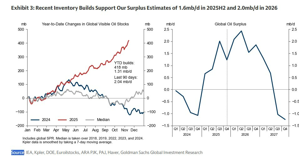 高盛:预计2026年布伦特/WTI原油均价将分别降至56/52美元/桶,主要依据如下: