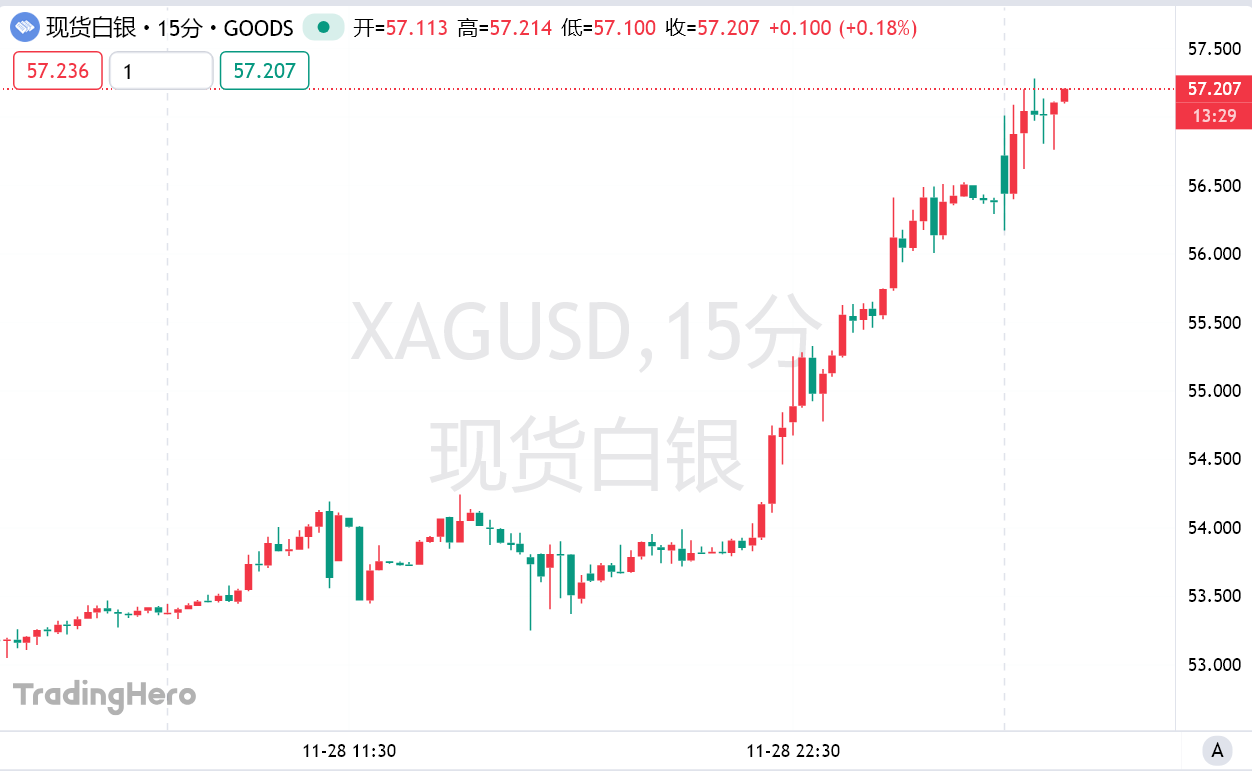 周一早盘现货白银价格突破57美元/盎司,超越上周五暴涨近6%时创下的前期高点。基于美国劳动力市场持续疲软及美联储官员一系列鸽派表态,市场目前已完全定价美联储将在12月进行25个基点的降息。