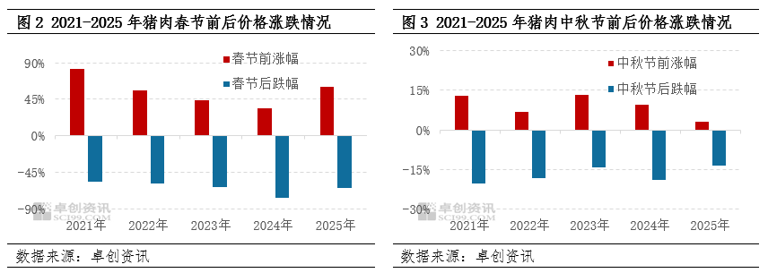 进入三、四季度,市场期待的“强反弹”并未如期而至。尽管9月开学季和中秋国庆双节带来了一定的备货需求,但屠宰企业的鲜销率提升幅度有限,所谓的“旺季”更多表现为价格的窄幅震荡而非单边上涨。从卓创资讯统计的数据来看,中秋节前需求对于价格的提振作用明显弱于春节,但节后价格回落的幅度往往更加显著。2025年中秋节前一周,白条猪肉价格仅仅上涨了3.12%,为近五年最低。而节后一周价格下跌的幅度则达到了13.57%,处于近五年平均水平附近。