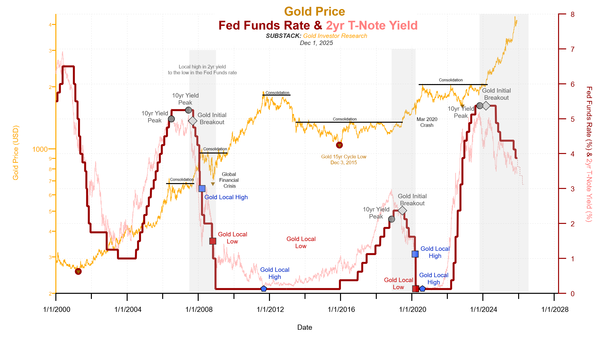 如果美联储继续以每次会议25个基点的速度降息,预计到2026年3月至4月,联邦基金利率将再次接近3%水平。当前的核心问题是:届时出现的黄金高点是否会同时成为主要周期高点?即便如此,也并不意味着黄金牛市的终结,而仅是第一阶段的完成。随后在确立主要周期低点后,将开启我们称为"量化宽松阶段"的第二轮牛市征程。