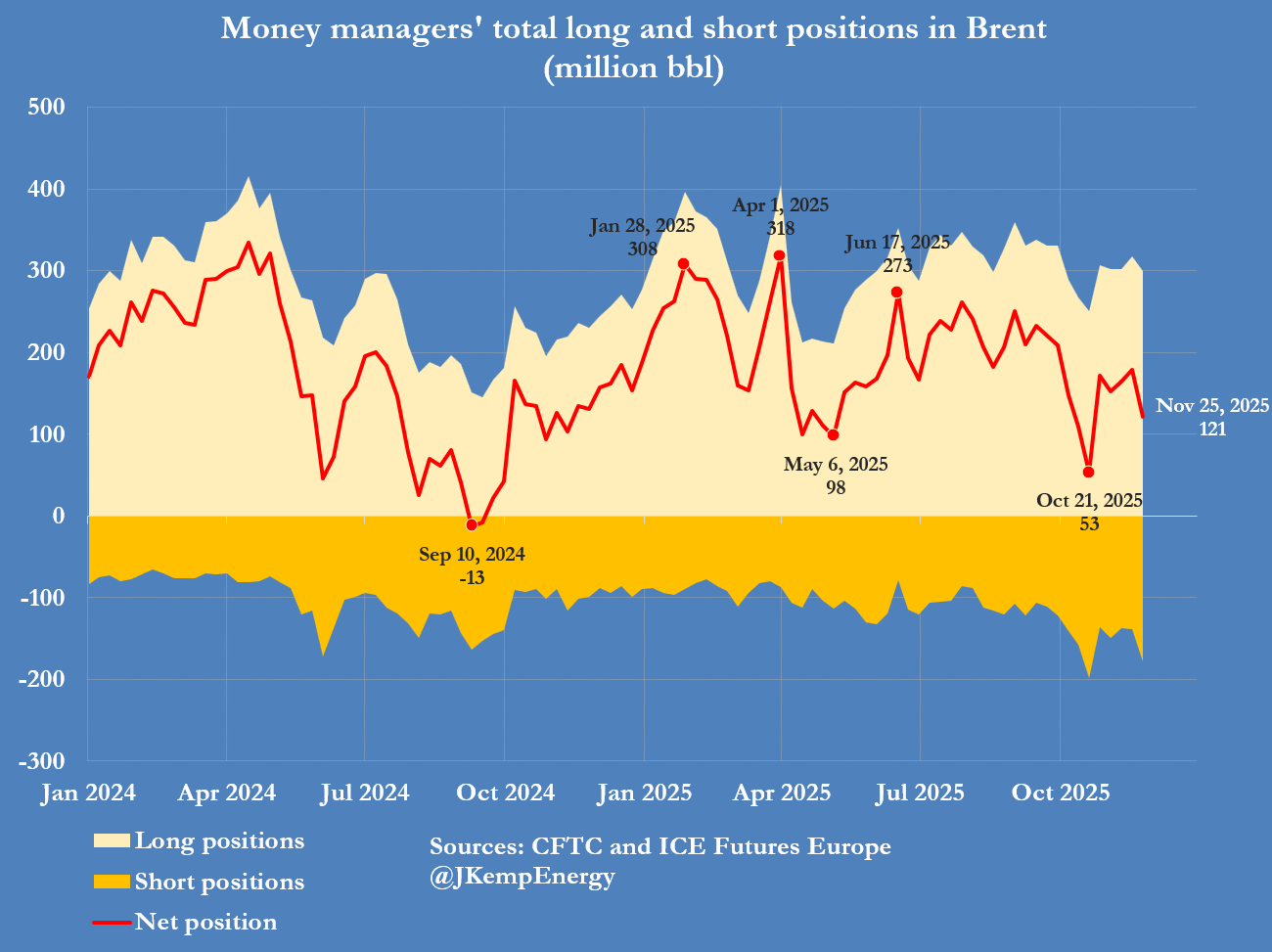 上周,随着美俄和平谈判细节公布,投资者恢复对原油的抛售——延续了六个多月以来明显的持仓量与价格下跌趋势。根据洲际交易所欧洲期货公司的备案记录,在截至11月25日的七天内,对冲基金及其他资金管理人卖出了相当于5700万桶布伦特原油的期货与期权。