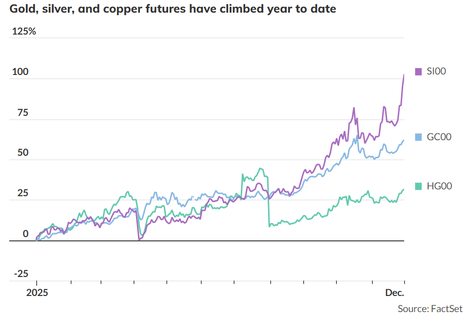 一场强劲的金属市场牛市行情,使得黄金、白银和铜在2025年都录得了可观的涨幅。
