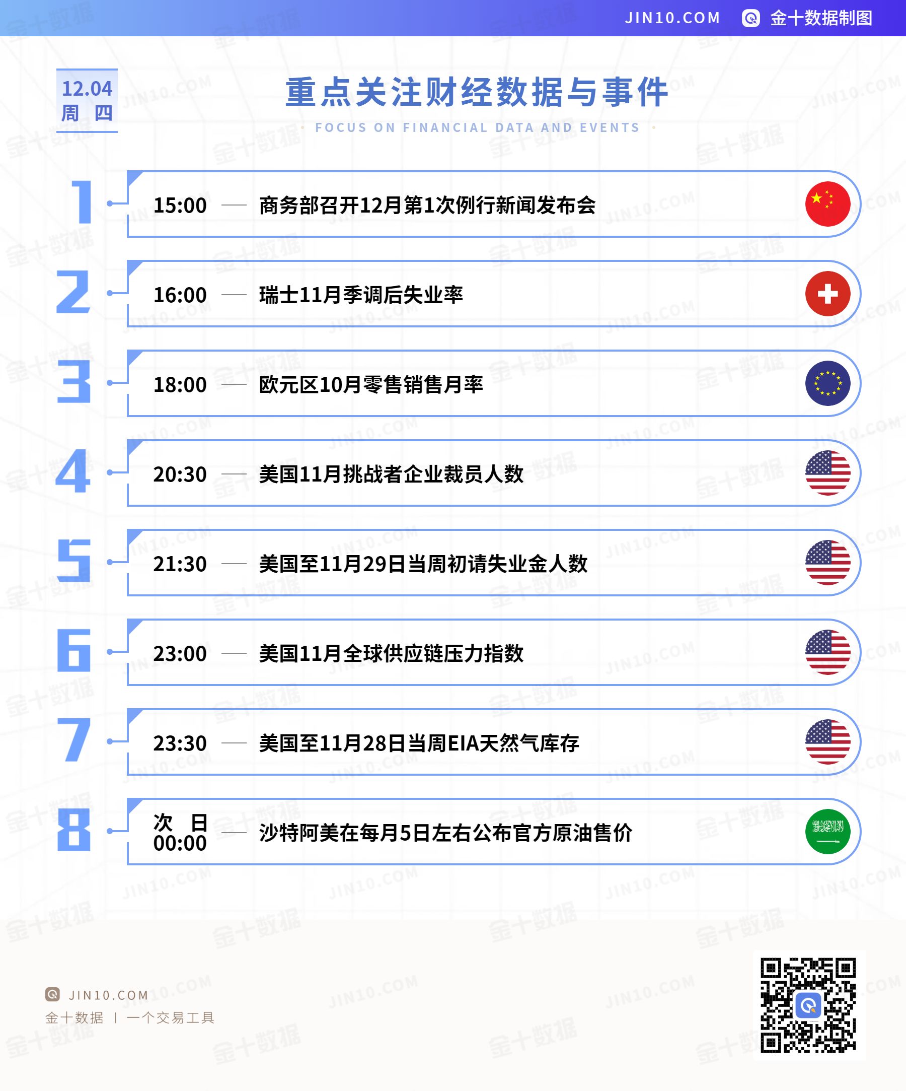 ☆15:00,中国商务部将召开12月第1次例行新闻发布会;