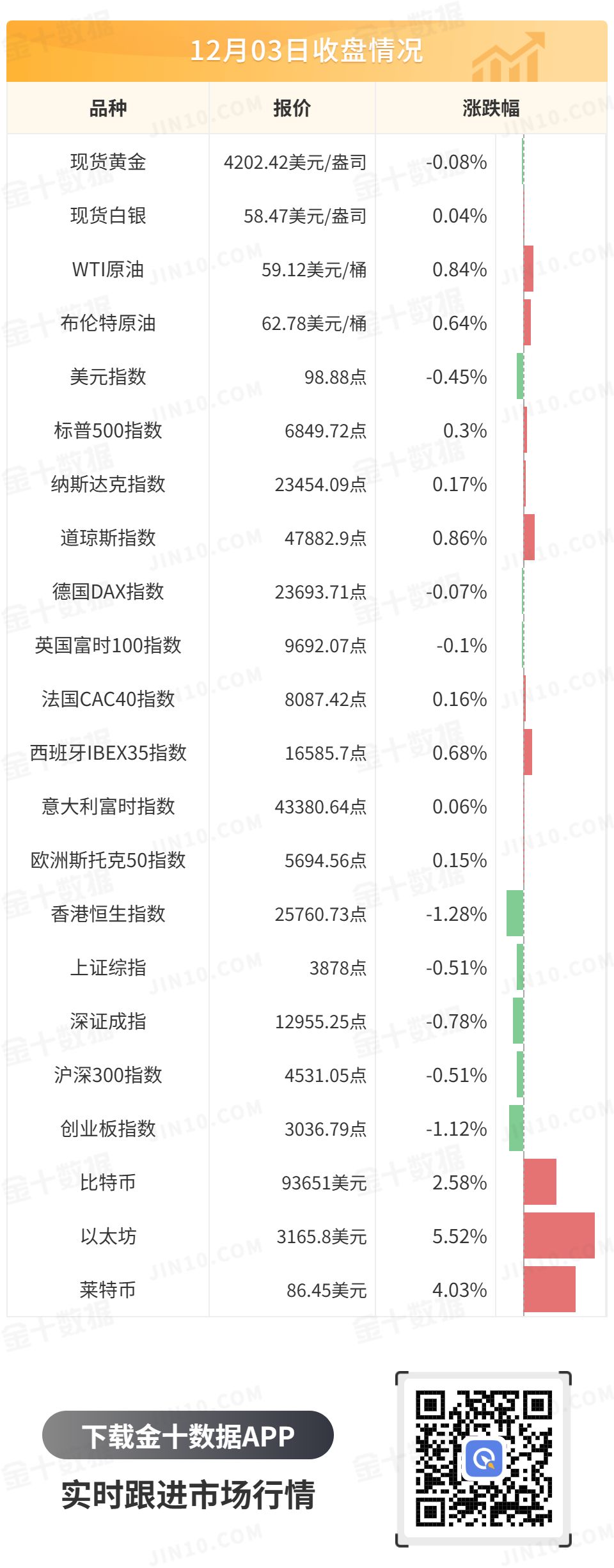ADP数据意外下跌,增强了美国下周降息的预期,但现货黄金在触及4240美元后回落,最终收跌0.08%,报4202.42美元/盎司;现货白银创下历史新高的58.98美元后回落,最终收涨0.04%,报58.47美元/盎司。