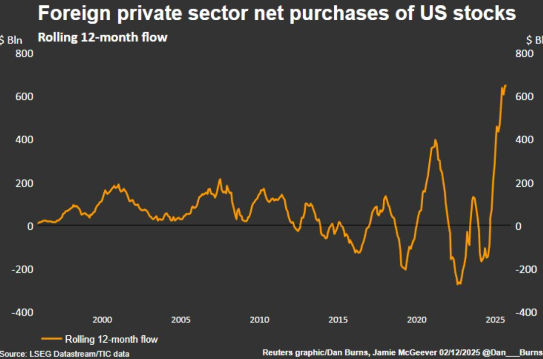 但现有证据表明,尽管2025年美国经济、政治和政策动荡不断,外国投资者对美国股票的需求从未如此强劲。