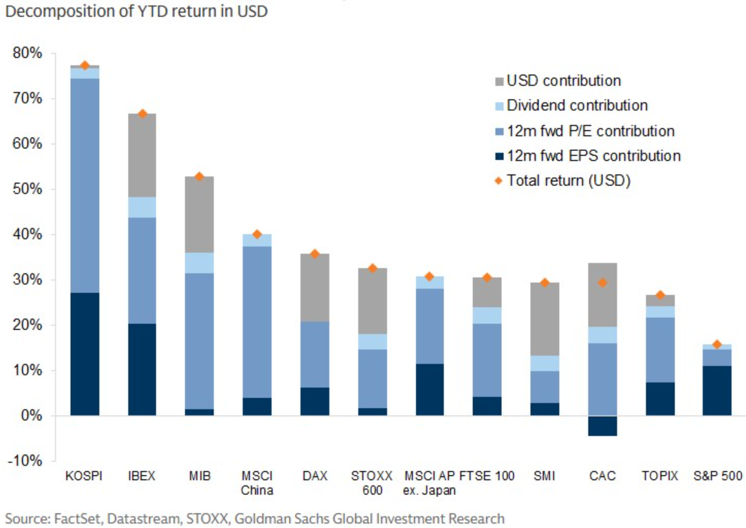 重要的是,非美市场的涨幅是以当地货币计价的,这意味着以美元计价,由于美元贬值,其涨幅可能会进一步扩大。巴西Bovespa指数年内迄今上涨30%,以美元计价则进一步上涨20个百分点。