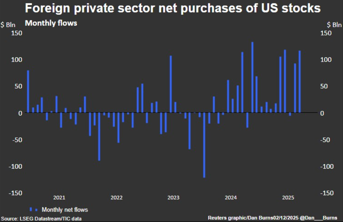 这一滚动12个月数据,部分受到了2024年美国总统大选前后强劲资金流入的提振。外国私人投资者月度净买入美国股票很少超过1000亿美元,但在去年9月和11月确实超过了,因为投资者大量买入股票,认为即将上任的特朗普政府将推行毫不掩饰的亲增长、“亲市场”的减税和放松监管议程。