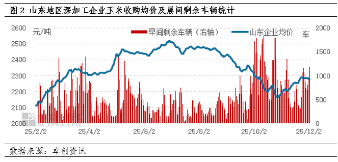 随着天气及农忙等影响减弱,华北地区基层农户售粮进度加快,目前山东、河北多数地区玉米水分仍在20%左右,少数水分降至16%左右,同时部分地区玉米霉变仍略偏高,受玉米水份及品质影响,贸易商整体建库意向不高,随收随走为主,华北地区原料玉米供给逐步恢复正常,11月24日-12月2日,山东地区晨间玉米剩余车辆保持在700-1000车,深加工企业日收购量已满足正常生产所需,收购价格出现小幅回落。东北地区基层农户售粮积极性不高,由于今年东北玉米整体品质与质量好,市场收购主体多于往年,导致基层农户持粮“待价而沽”,玉米价格走势明显强于华北地区。由于东北与华北地区粮价出现差异,导致两地玉米淀粉价格走势出现分化。