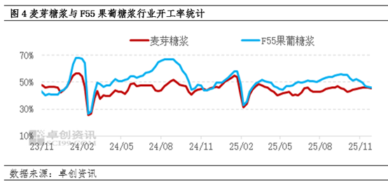 淀粉糖作为玉米淀粉最主要的下游消费,占比接近40%。进入12月之后,随着双十一需求的结束及北方各地气温转冷,下游食品、制糖、冷饮及啤酒等行业需求进入季节性淡季,其中液体糖(麦芽糖浆、果葡糖浆及葡萄糖浆等)表现尤为明显,整体市场表现明显弱于糖粉类(结晶葡萄糖、麦芽糊精等)。目前下游饮料进入需求淡季,终端需求减少,导致液糖生产企业停机及减产的情况或逐步增多,对于玉米淀粉需求量产生抑制的作用。据卓创资讯数据显示,截止到12月2日,国内麦芽糖浆开工负荷为45.74%,周环比下降0.08个百分点,F55果葡糖浆开工负荷为46.01%,周环比下降0.70个百分点。由于市场整体签单及走货存在压力,部分下游生产企业或降负荷生产,下游需求或持续下降。