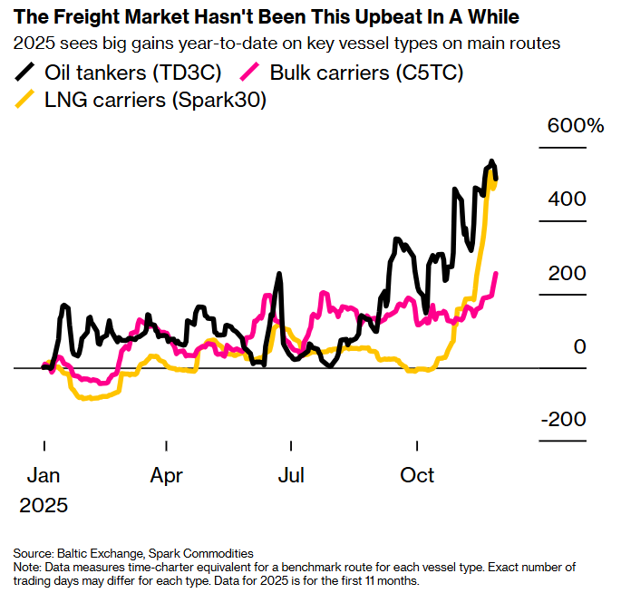 全球范围内,从能源到大宗矿石的跨洋商品海运价格正迎来罕见的年底飙升,冲突、制裁以及激增的产出正在颠覆全球供应链。