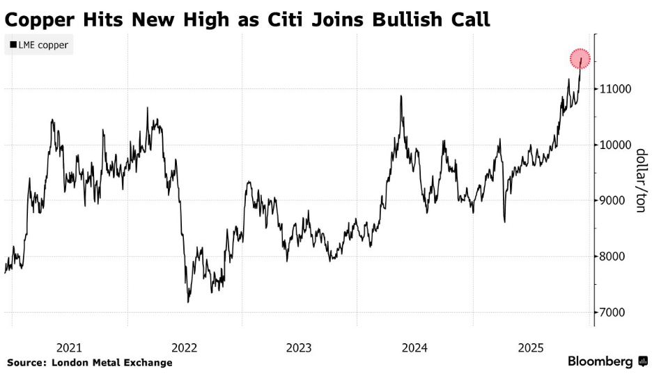受花旗发布的乐观价格展望推动,加之交易员预期美国囤货将导致铜短缺,铜价周五创下历史纪录。