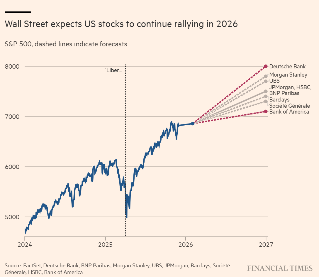 德意志银行预测标普500指数到2026年底将达到8000点,意味着与2025年大致相同的增长率——这是主要银行中最乐观的预测。