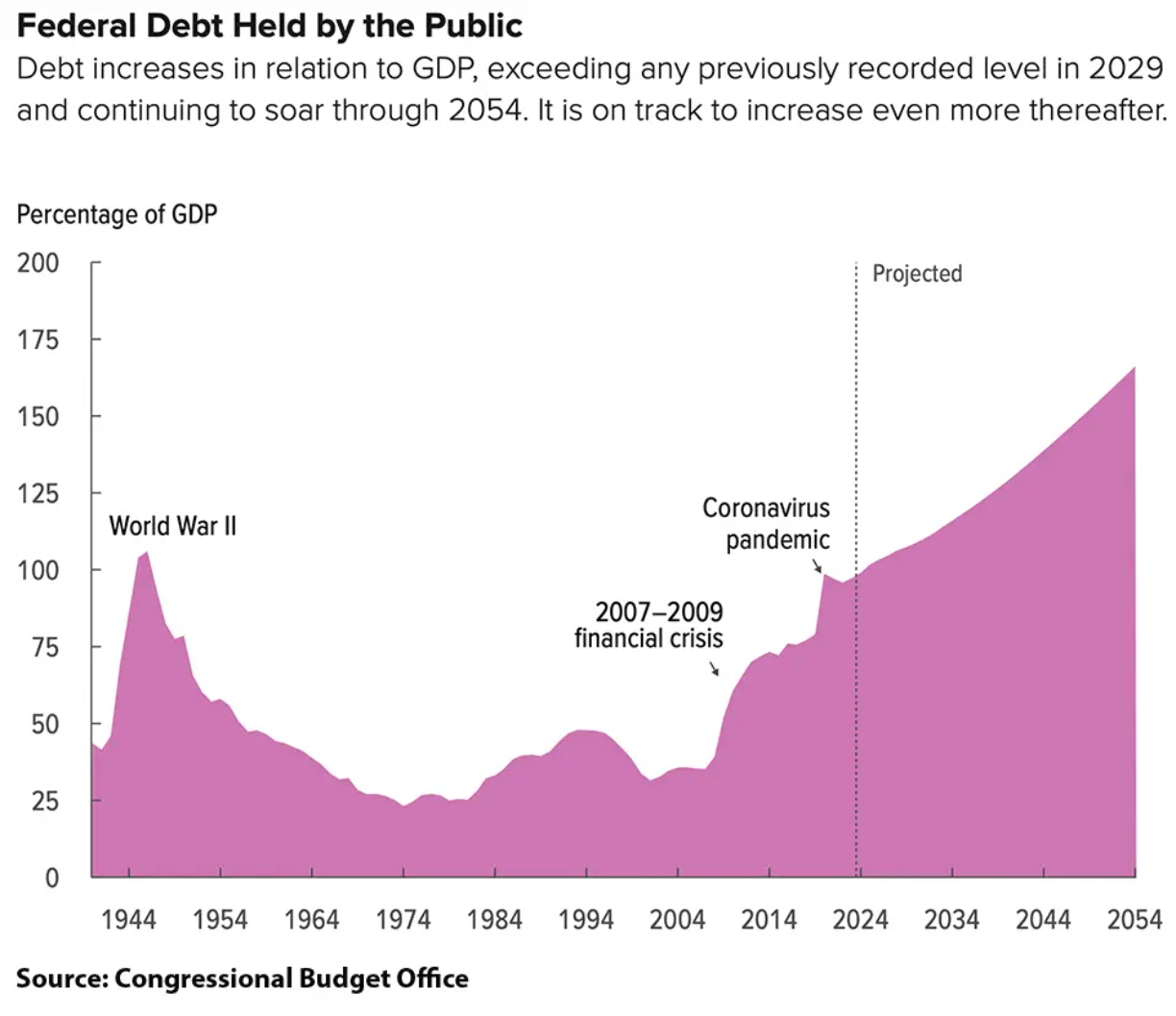 弗兰克尔直言不讳:财政紧缩“最终将在不可预见的未来到来”,但前提是一场“严重的财政危机”。想象一下这样的场景:债券义警抛售美国国债,利率飙升以惩罚联邦政府的债务违约行为,美国信用评级被下调,美元霸权摇摇欲坠。美国国会预算办公室(CBO)的长期展望警告,若不采取行动,到2055年债务占GDP比率将飙升至156%,挤出私人投资并抑制经济增长。