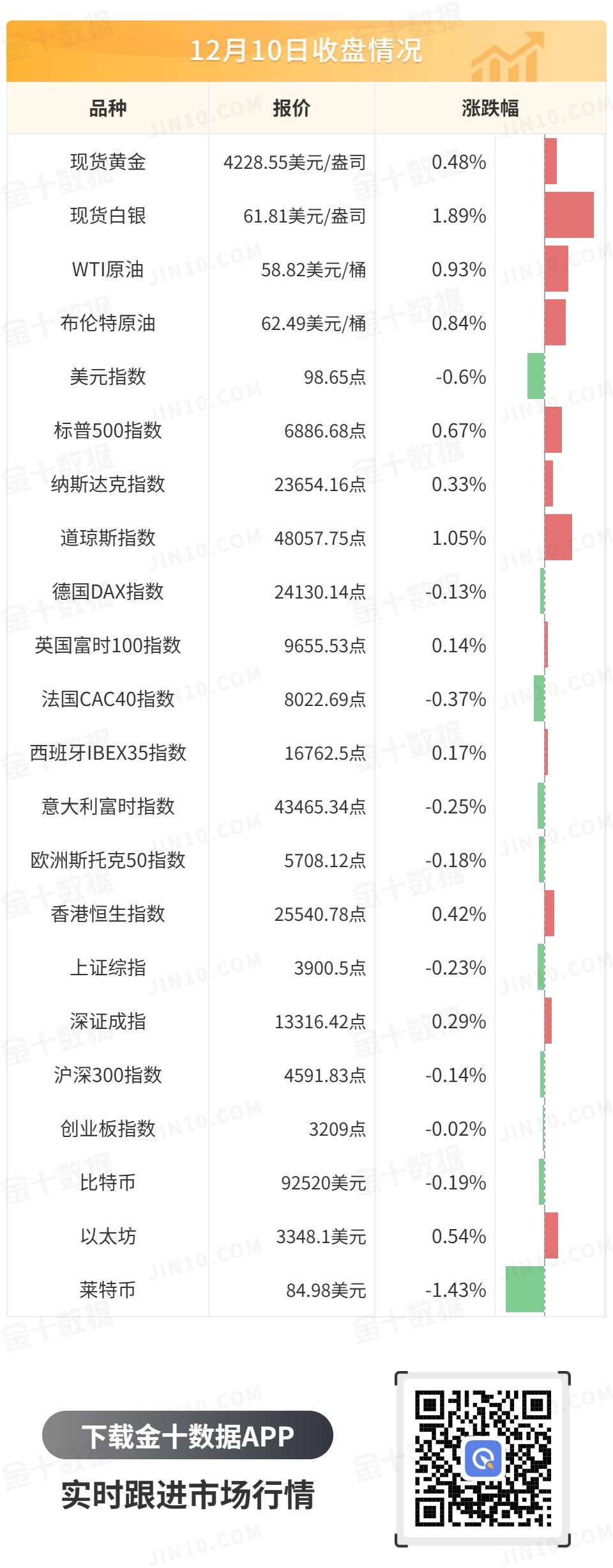 美联储宣布连续第三次降息后,现货黄金一度重回4230美元上方,最终收涨0.48%,报4228.55美元/盎司;现货白银日内大涨逾1美元,续创历史新高,最终收涨1.89%,报61.81美元/盎司。