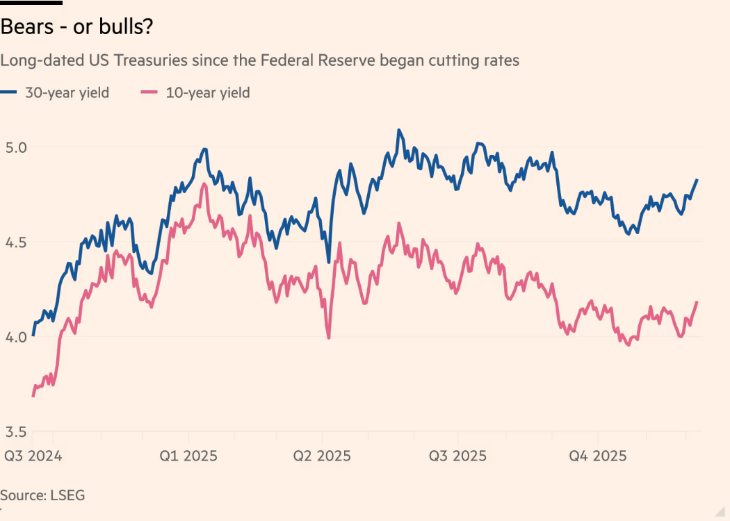 如果美联储的意图难以解读,债券市场能否给出更清晰的线索?目前来看并不能。美国大部分企业贷款成本的基准利率正在上涨,而正常情况下,若美联储倾向于降息,这些利率本应下跌。自10月底以来,美国10年期国债收益率已上涨0.21个百分点,30年期国债收益率上涨0.25个百分点。