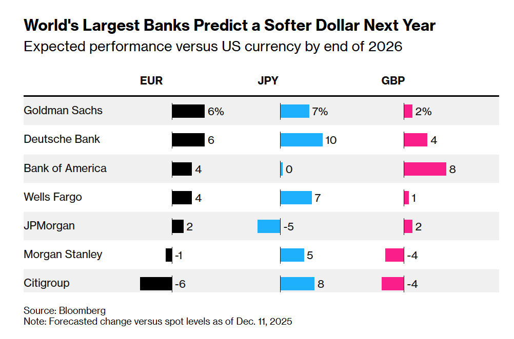 因此,六家以上大型投行的预测人士普遍认为,美元将相对日元、欧元、英镑等主要货币走软。根据彭博社编制的共识预测,美元指数到2026年底将下跌约3%。